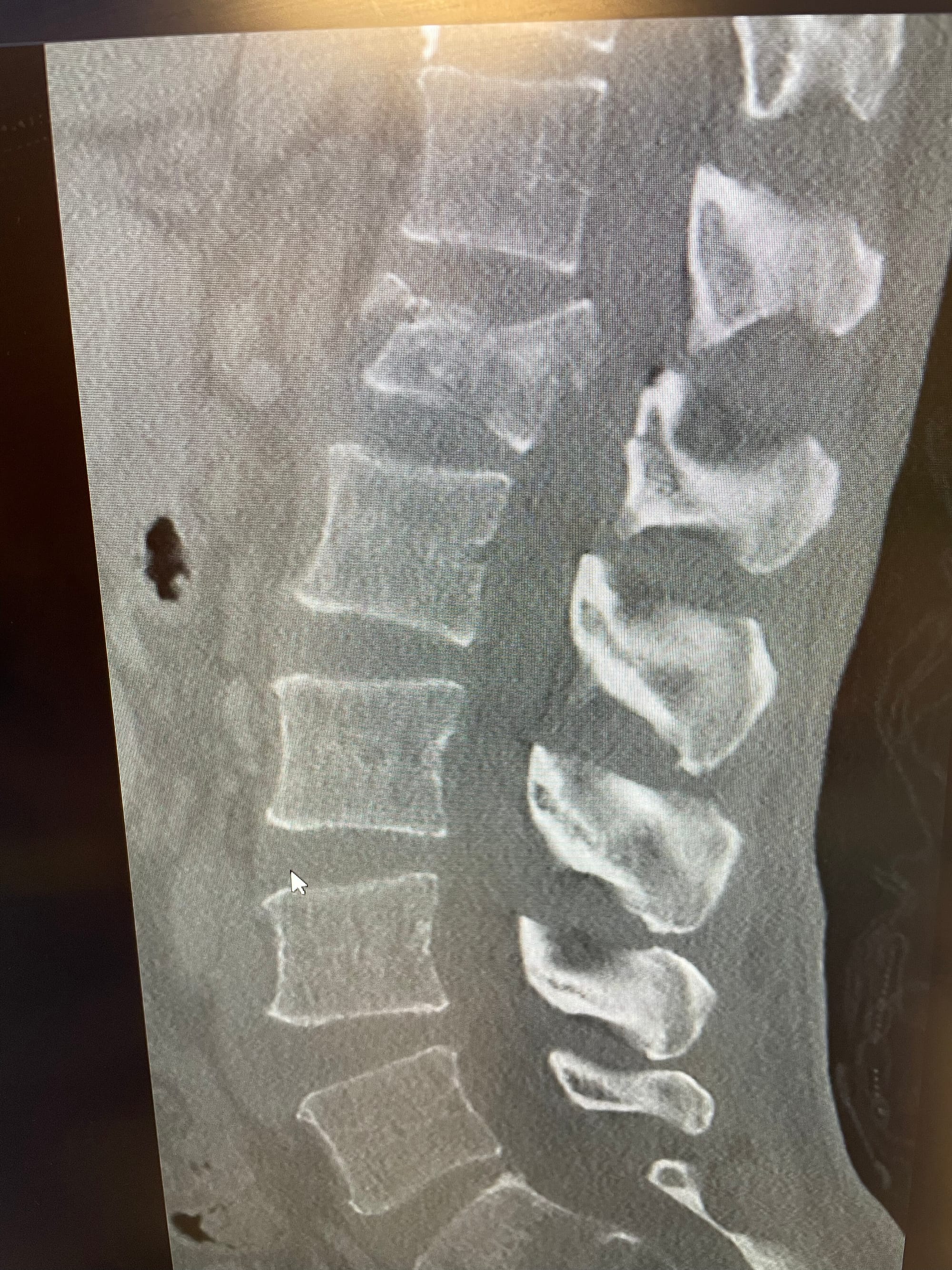 I had my first follow-up meeting with the surgeon who worked on my back. Before the meeting, they took X-rays, and she was happy with how things looked. I asked about current physical restrictions, and I'm allowed to do anything I want using my best judgement. I also asked questions about the surgery, and Cathy and I got to view old and new X-rays and CAT scans. They also took an MRI, but I don't think we saw it a the meeting. Actual X-rays of my spine before surgery and this week (with hardware) are shown below.