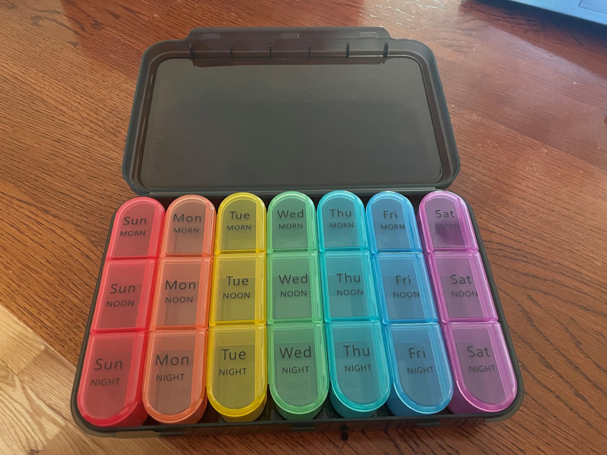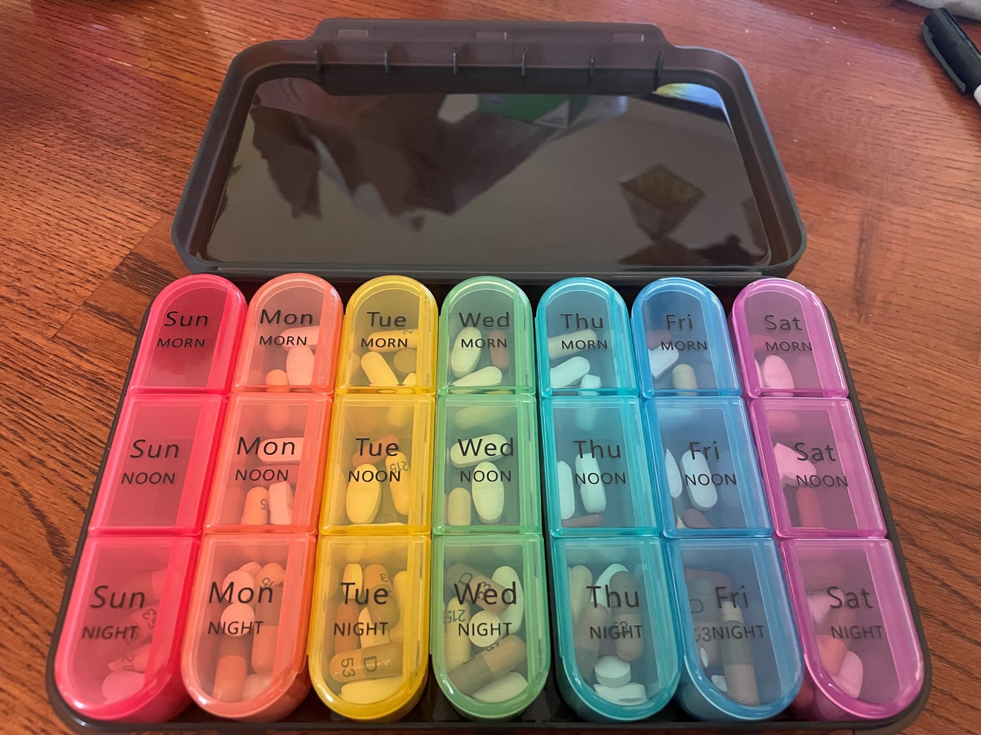After an hour and a half nap (hey, I'm healing here), my feet were killing me. My feet always hurt, but this was 5 or 6 level pain and in new places (a little towards my ankles from the base of my big toes and in my ankles). This might be a result of the climbing yesterday. Cathy also asked me if I had taken my 2 pm painkillers. I'm pretty sure I didn't, but nap. This elicited comments about my refusal to use the weekly pill box she purchased because then we would know as the pills from the afternoon compartment would be gone.* I've been waiting to fill the box until I had a chance to take pictures and blog about. Pictures are below. While it still looks like a lot of pills to me, it's about half of what I was taking during in-patient rehab. So, now I have a giant pill box to make sure I don't mess up. I'm officially an old person.